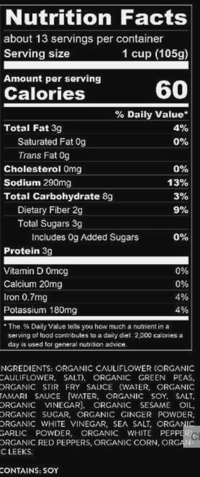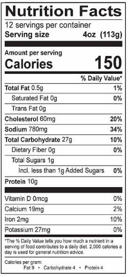 Serving Size:1/2 cup (128g) Amount Per Serving Calories from Fat 20 Calories 120 % Daily Value* 5% Saturated Fat 1g Trans Fat 0g Polyunsaturated Fat 0.5g Monounsaturated Fat 1g 0% Cholesterol 0mg 23% Sodium 540mg 12% Potassium 420mg 6% Total Carbohydrate 18g 24% Dietary Fiber 6g Sugars Less than 1g Protein 6g 0% Vitamin A 0% Vitamin C 2% Calcium 10% Iron 10% Phosphorus 10% Magnesium 15% Manganese |